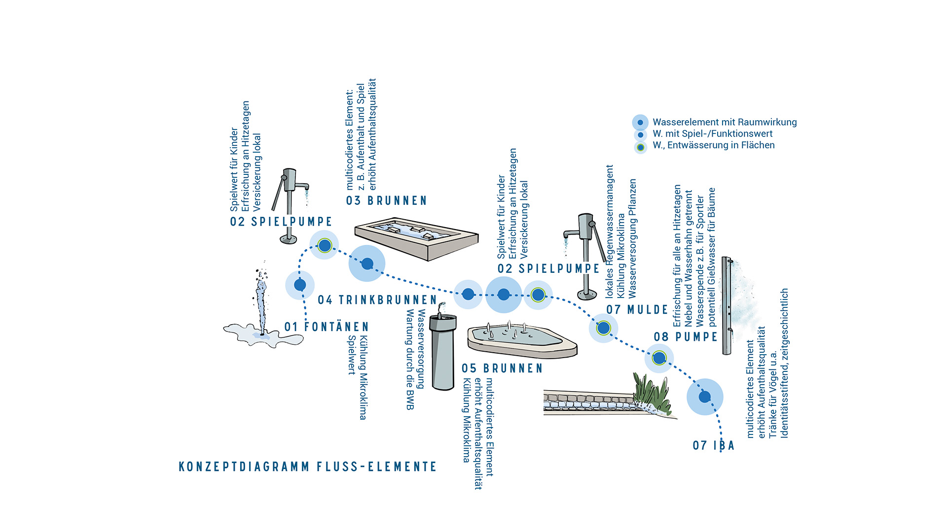 Vernetzung der Grünflächen einschließlich des Straßenraums der Cuvrystraße als ökologischer Grünzug unter Verwendung des Elements Wasser