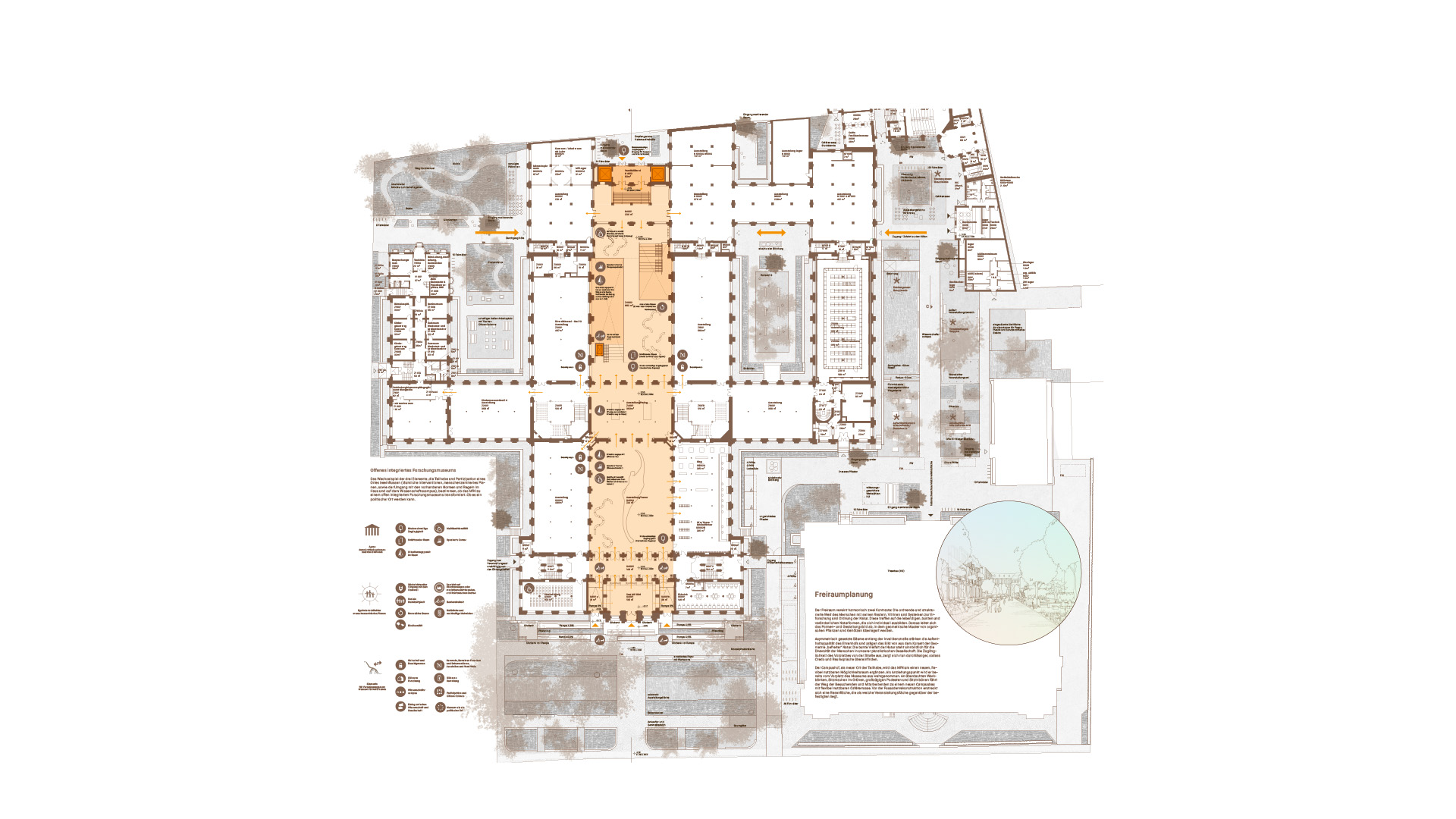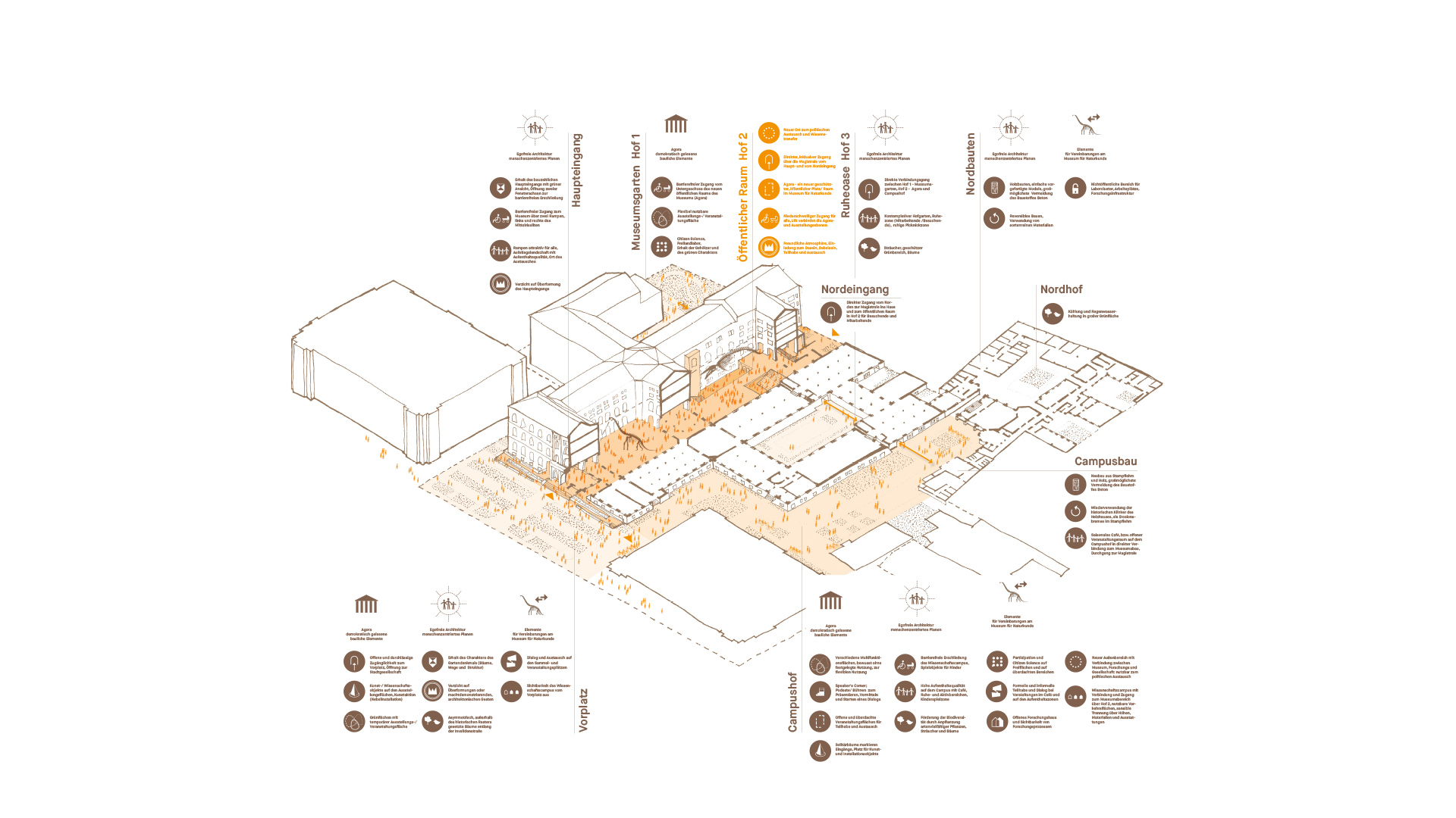 Das Gartendenkmal mit seinem besonderen Baumbestand wird respektvoll und behutsam an die heutigen Bedürfnisse des Museums und der Gesellschaft angepasst. Asymmetrisch gesetzte Bäume entlang der Straße stärken die Aufenthaltsqualität und erhalten das Bild von ‚befreiter‘ Natur aus dem Korsett der Geometrie. Der Kontrast zwischen der bunten Vielfalt und starrer Monumentalität vereint die Diversität der Menschen in einer pluralistischen Gesellschaft. Über witterungsgeschützte Werkbänke, Sitznischen im Grünen, großzügige Podeste und Sitztribünen führt der Weg Besuchende und Mitarbeiter*innen vom Platz über den Campushof zum Neubau mit flexibler Caféterrasse.