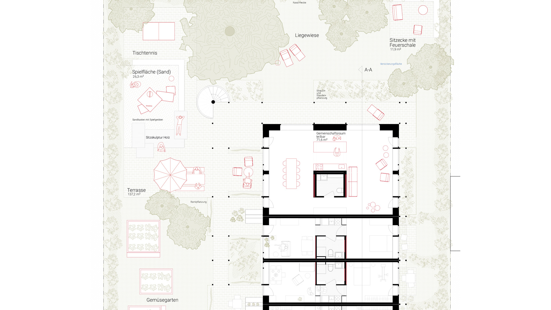 Der »Hausgemeinschaft« stehen Gemeinschaftsflächen im Erdgeschoss und im Erschließungsbereich der Gebäude zur Verfügung. In den »Wohngemeinschaften« sind Küche, Ess- und Wohnräume gemeinschaftlich organisiert und ermöglichen so sehr kleine individuelle Bereiche.
