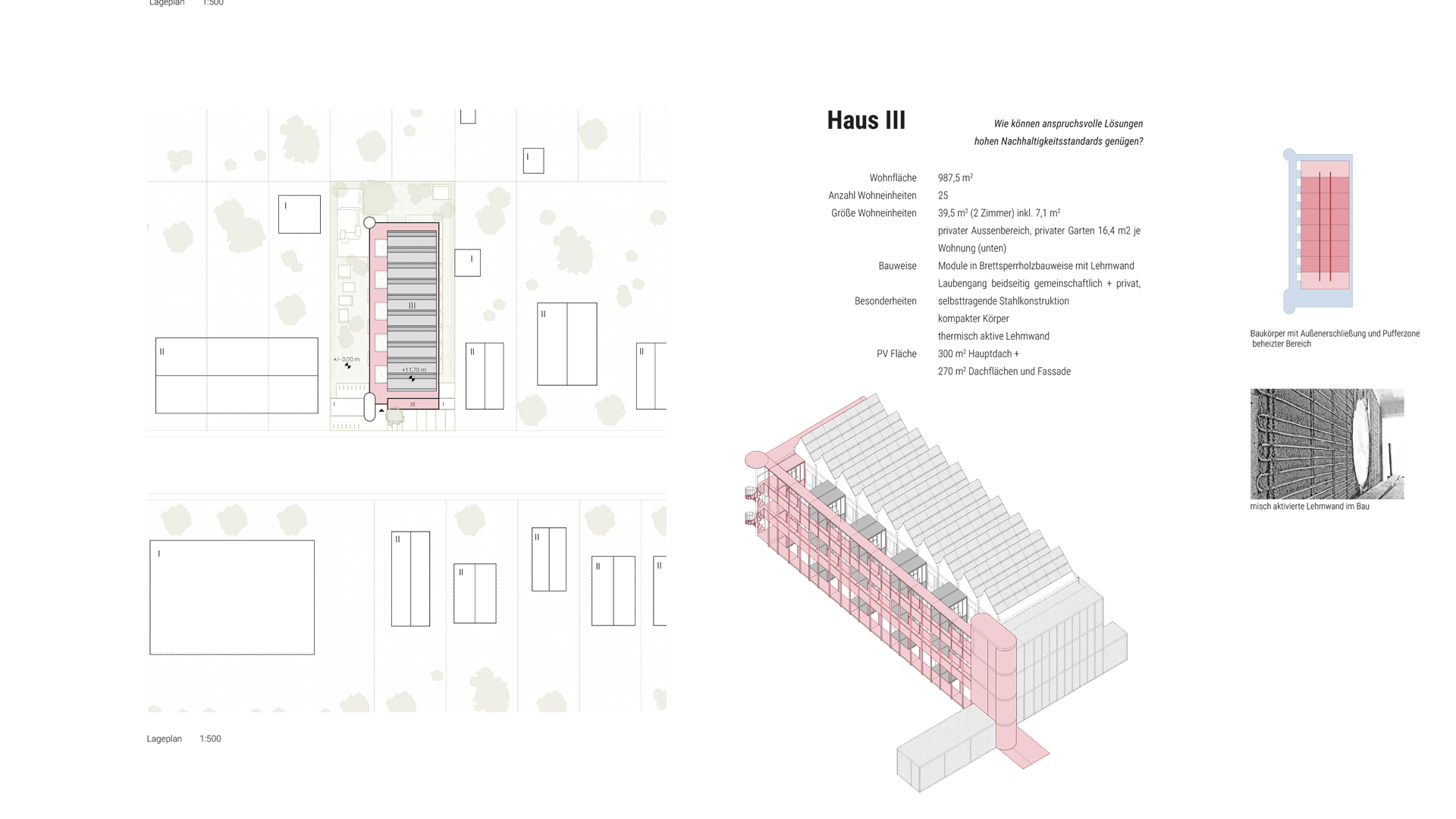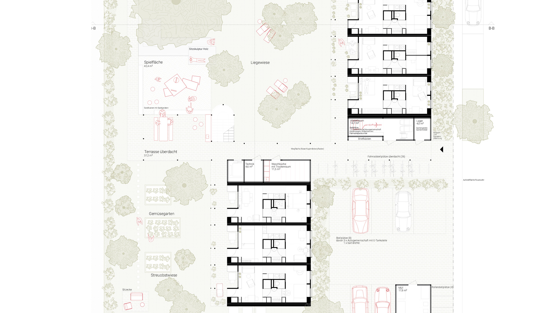 Freiräume bieten die räumliche Grundlage und überraschende Möglichkeiten, Arten des Zusammenlebens immer wieder neu auszuhandeln. Sie nehmen eine übergeordnete Rolle für das soziale Miteinander ein und erweitern zudem den privaten Individualraum. Die Freiflächen machen vielfältige Angebote für Aufenthalt und Bewegung und schaffen so einen wichtigen Ausgleich für die stark reduzierte Wohnfläche. Darüber hinaus übernehmen sie wichtige ökologische Funktionen. Jede der Kleinstwohnungen erhält Zugang zu einem eigenen Freiraum in Form eines Balkons/Wintergartens oder einer gemeinschaftlich genutzten großen Terrasse. Zudem steht der Bewohnerschaft ein großer Gemeinschaftsgarten zur Verfügung.
