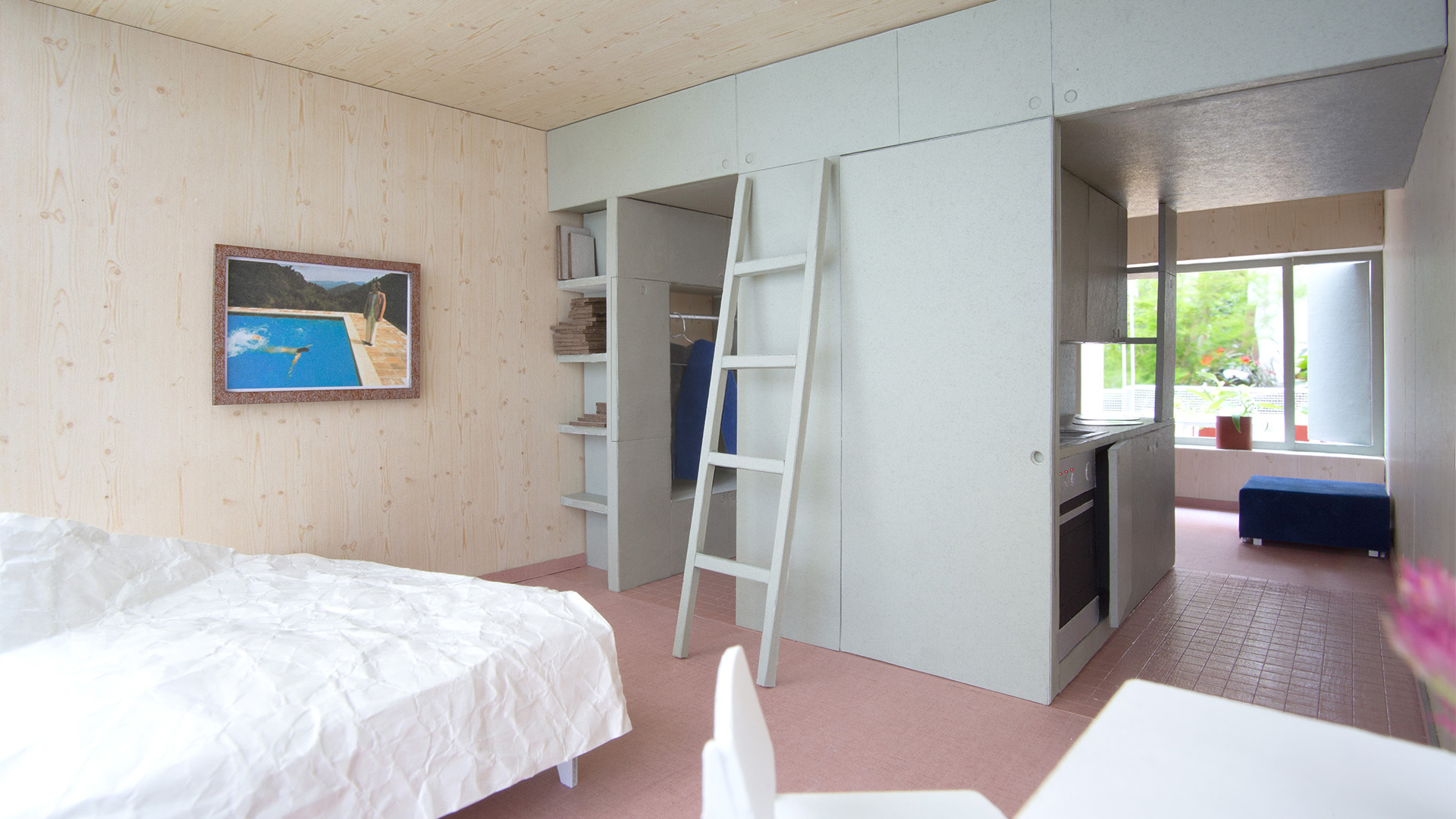Grundsätzlich gilt es, Mehrfachnutzungen zu provozieren und so vielfältige Raumsituationen auf der geringen zur Verfügung stehenden Fläche zu ermöglichen. In einem Teil der Wohnungen entstehen durch eine vergrößerte lichte Raumhöhe besondere Nutzungsmöglichkeiten und ein angenehmes Raumgefühl – trotz minimaler Grundfläche. Die Grundausstattung jeder Wohnung bildet ein Basiselement, das den Bewohner*innen unterschiedliche Nutzungs- und Aneignungsmöglichkeiten bietet. So wird beispielsweise ein Treppenpodest einmal zum Schreibtisch oder dient neben diversen Sitzmöglichkeiten auch als zusätzliche Arbeitsfläche beim Kochen. Zudem sind platzsparend Stauräume für den alltäglichen Bedarf darin integriert. Weitere Stauraum- und Lagerflächen für gemeinschaftlich genutzte Güter und Sperriges sind in WG- und Hausgemeinschaftsflächen verfügbar.