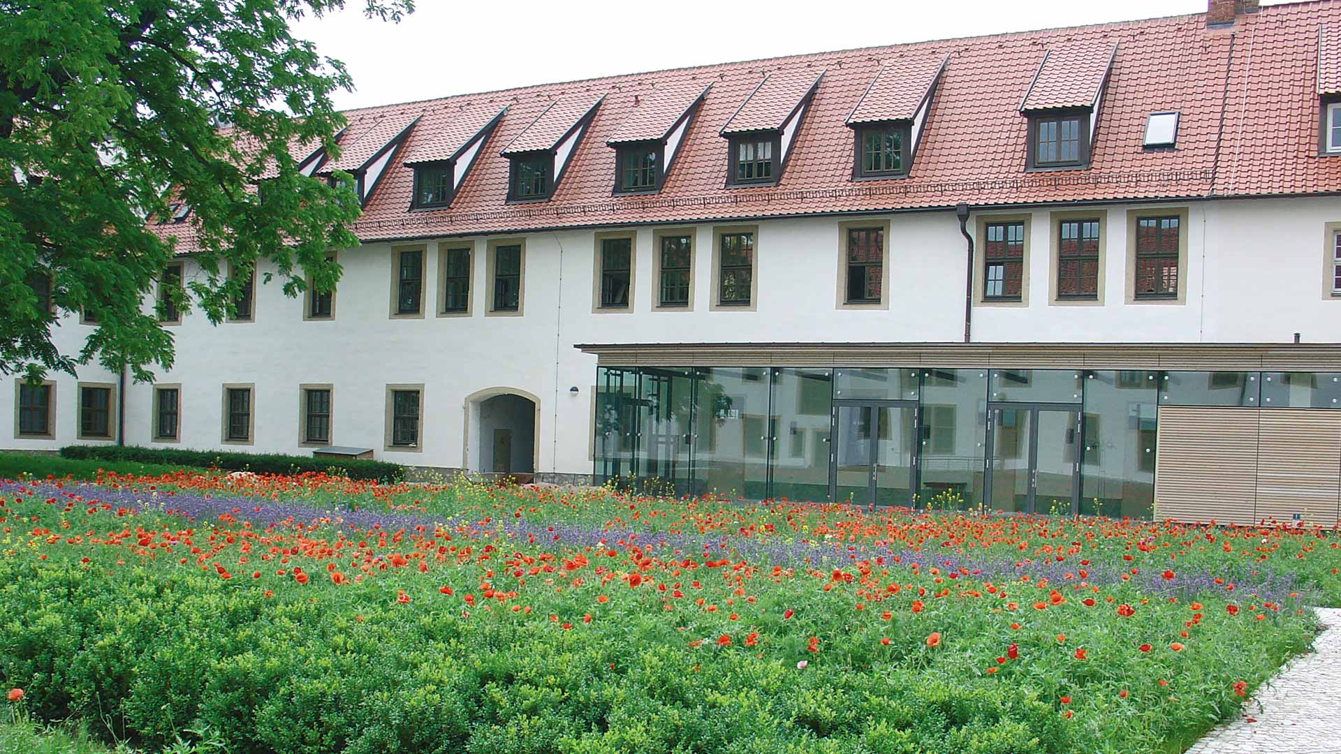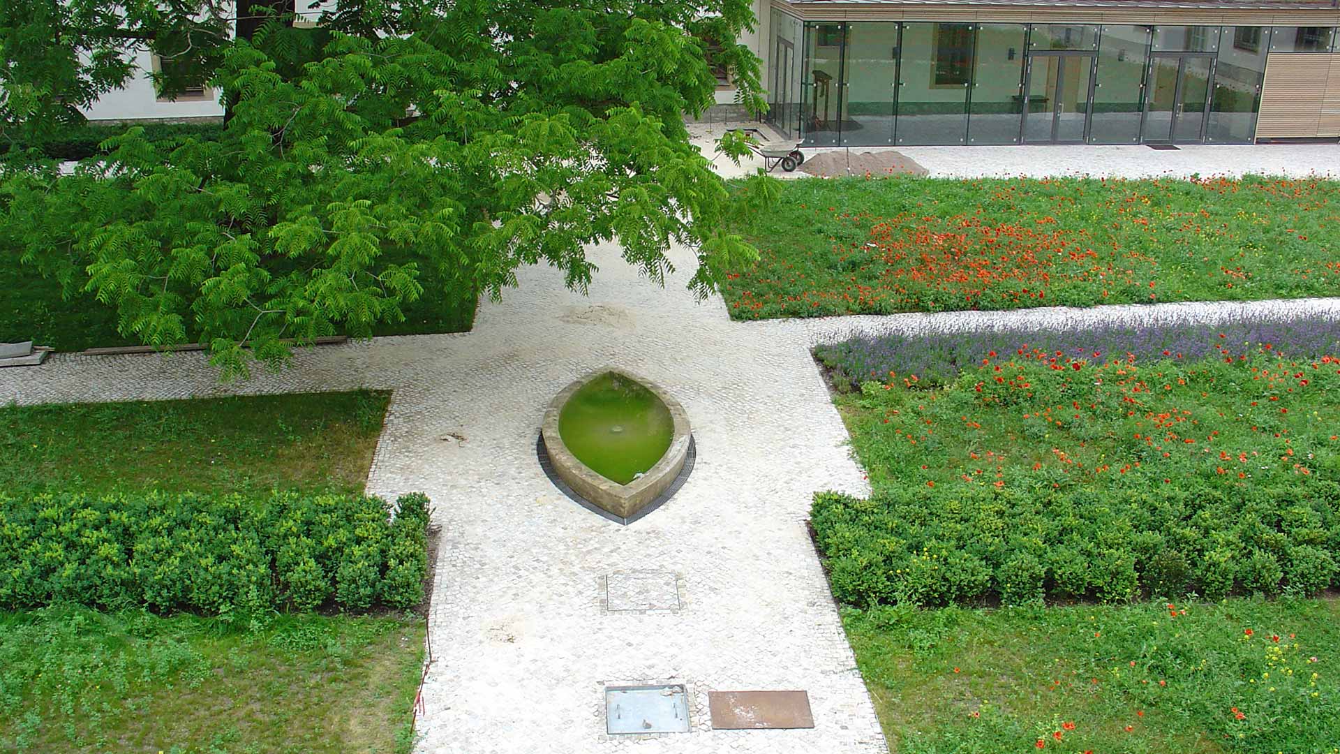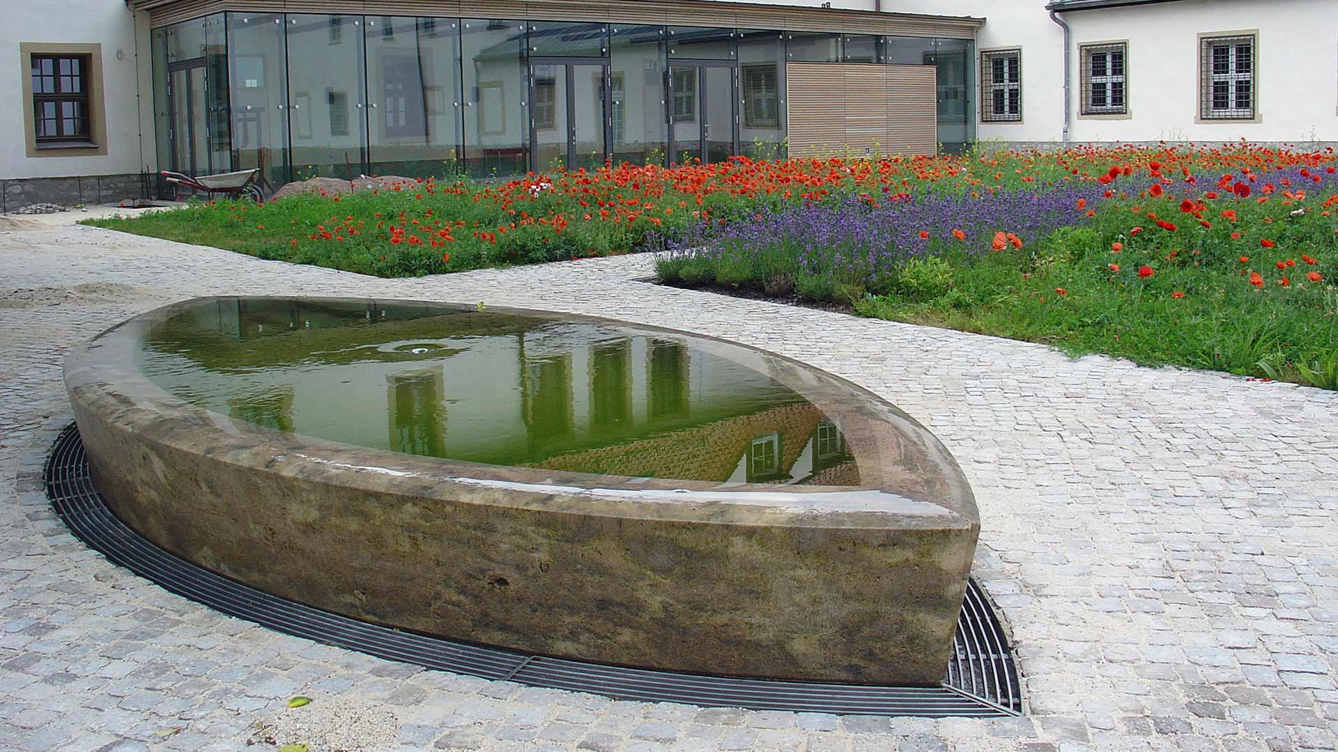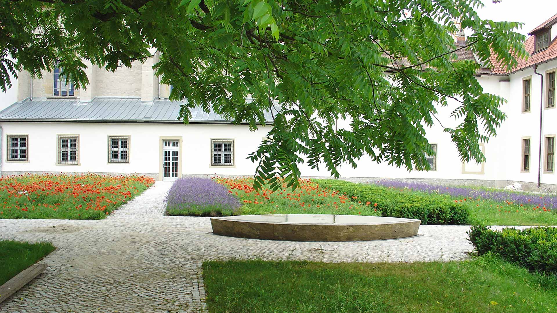 Der Innenhof des Wigbertiklosters wird von den Angestellten der Stadtverwaltung sowie von den Gemeindemitgliedern genutzt. Gleichzeitig ist er Kulisse für diejenigen, deren Fenster zum Hof hin orientiert sind. Das geöffnete Tor lockt ferner Besucher, Erfurter Bürger und Touristen herein. Der Entwurf für den Innenhof greift den vorhandenen zentralen Weg auf. Schräg gegeneinander versetzte Streifen aus geschnittenem Buchs und Lavendel gliedern den Raum zu beiden Wegseiten. Innerhalb der Pflanzstreifen sind kunstvoll montierte Holzblöcke als Sitzbänke integriert, die an heißen Sommertagen einen schattigen Aufenthalt in der Weite des Hofes bieten. Im ruhigen Wasser des linsenförmigen Brunnens spiegelt sich die historische Umgebung.