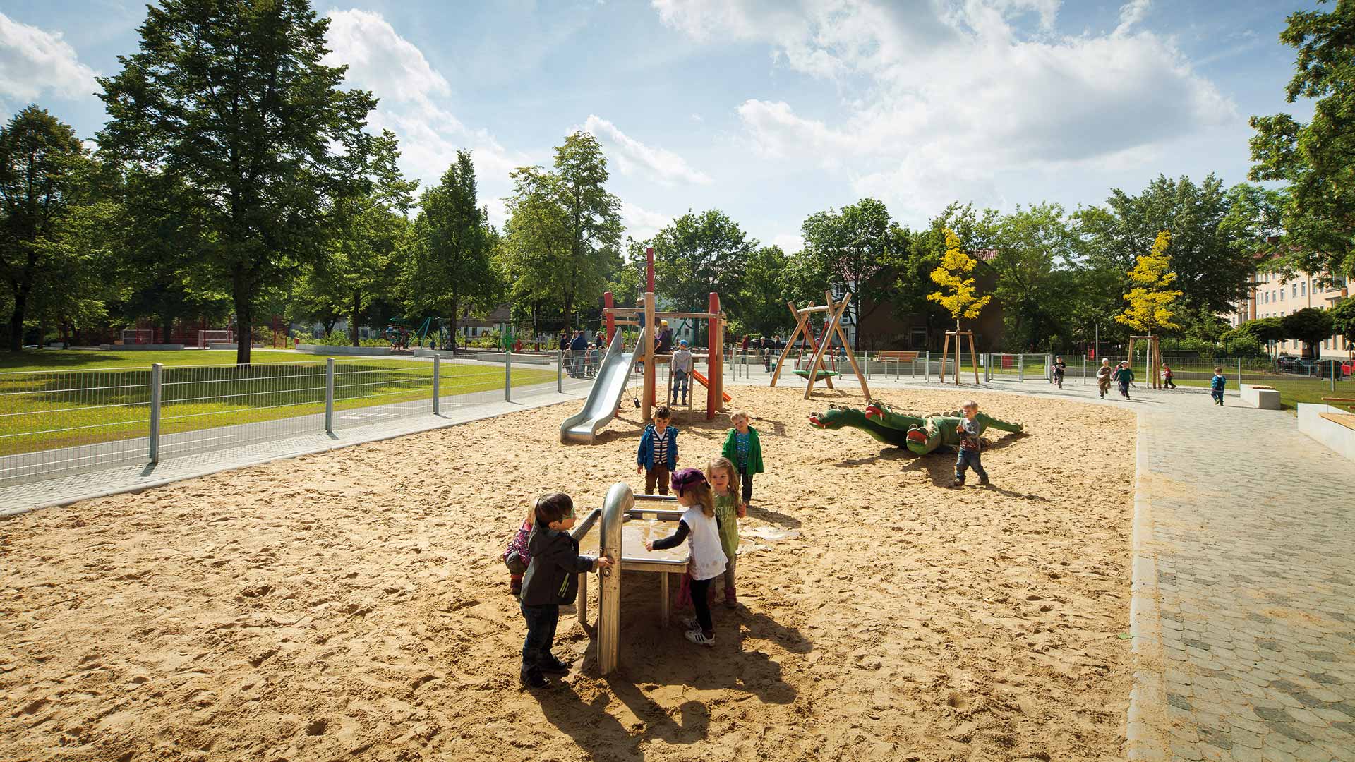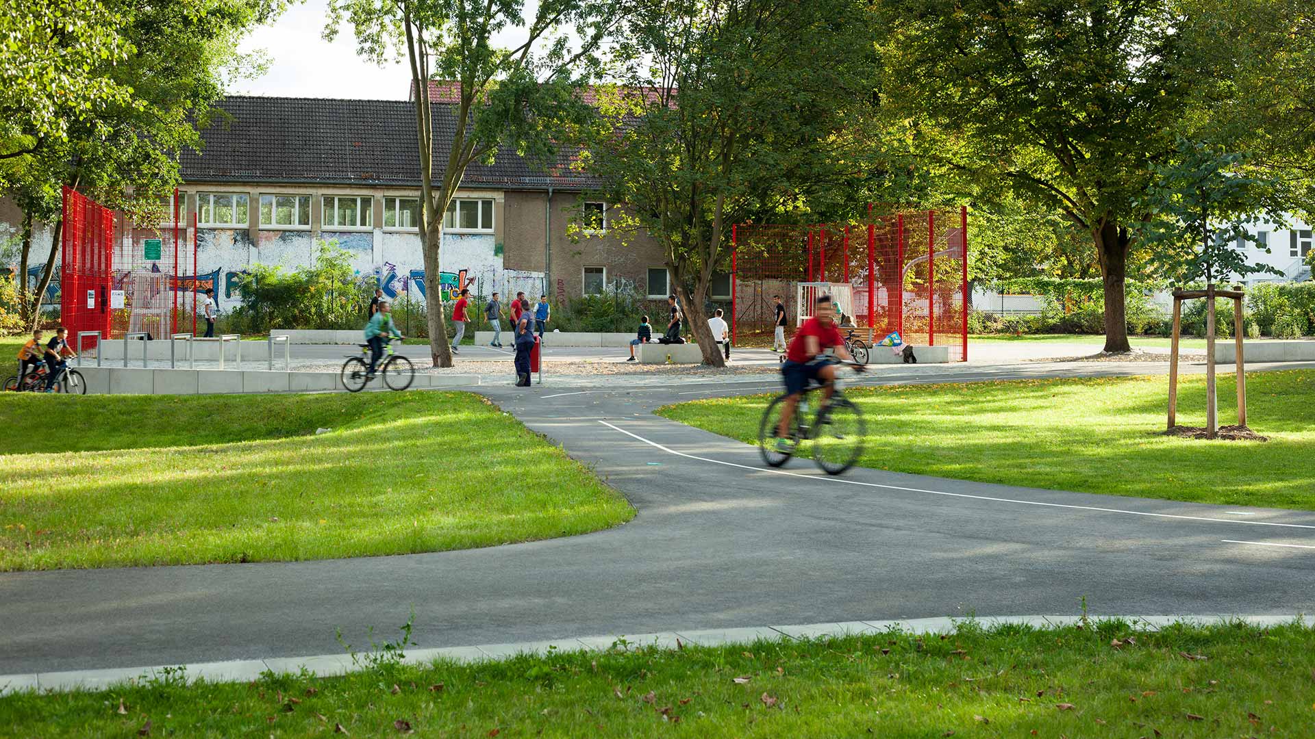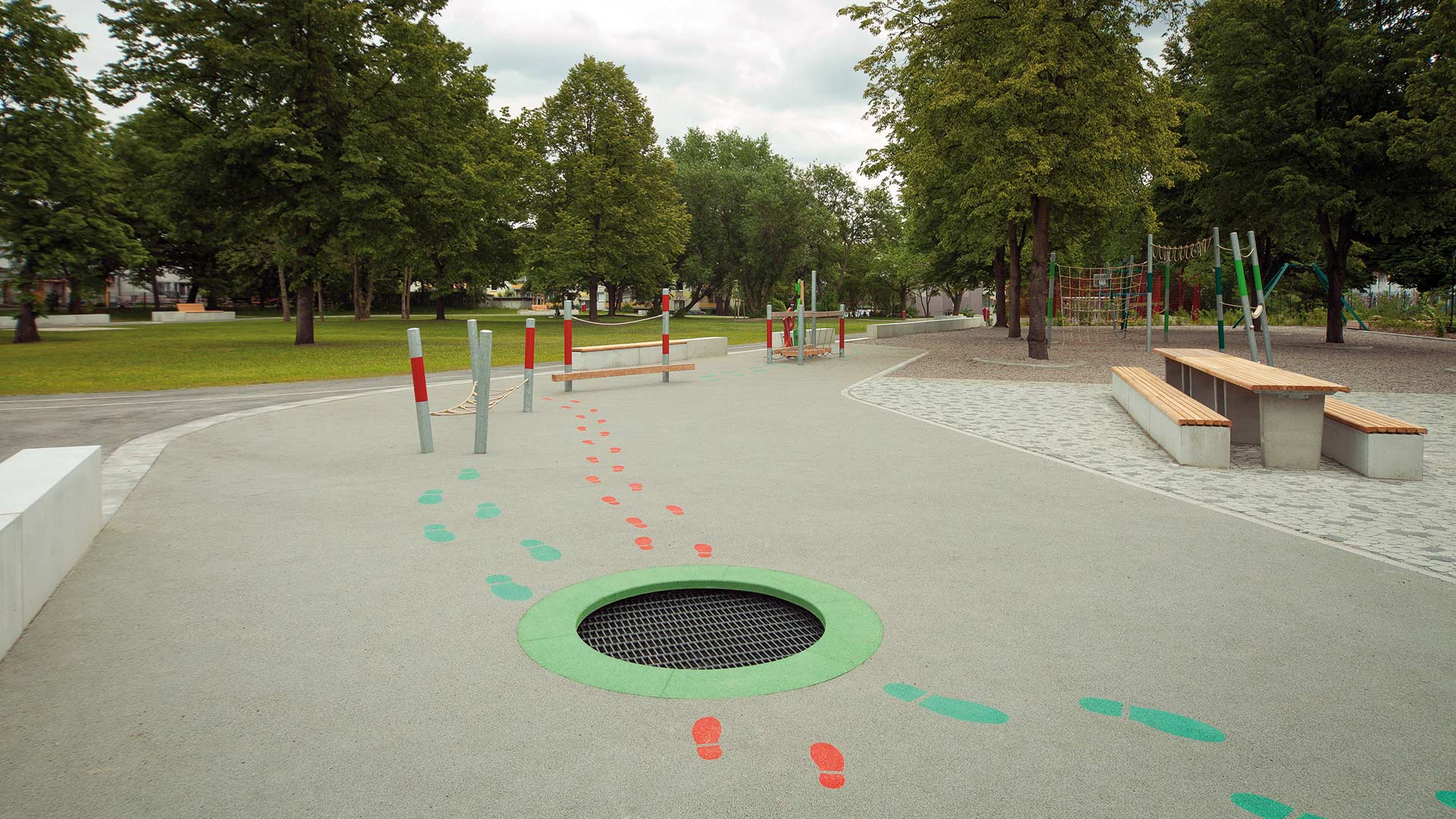 Parcours für alle, Tischtennisplatte und ein Kleinkinderspielplatz mit Wasserpumpe. Neben Kletterspielplatz und Parcours bietet die Fläche auch einen Aufenthaltsbereich, auf dem eine lange Tafel ihren Platz hat. Der vorhandene Baumbestand bleibt so weit wie möglich erhalten und wird punktuell ergänzt. Die Grünflächen außerhalb des Rundweges werden gestaffelt nach Strauch- und Gehölzflächen sowie verschieden häufig gemähte Wiesenflächen. Zu den Rändern hin werden die Strukturen höher und bieten so eine pflanzliche Abgrenzung zu den Straßen.