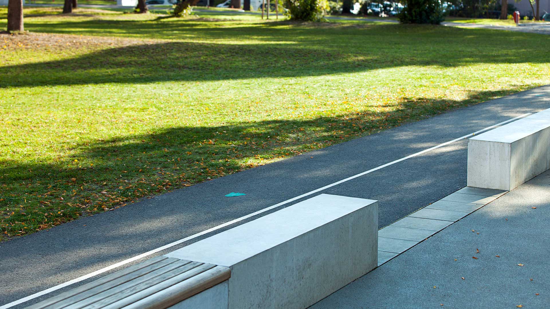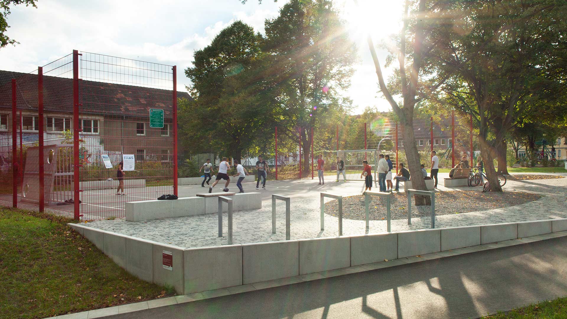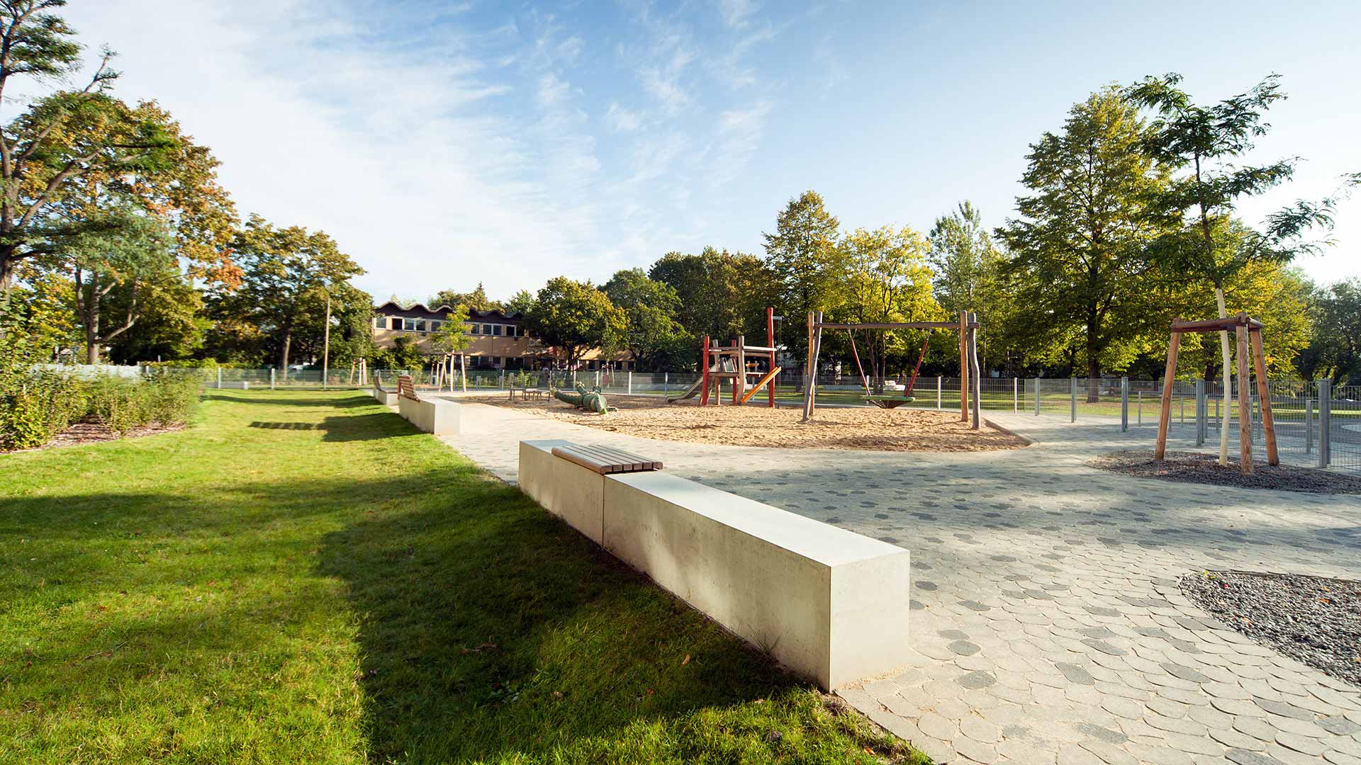Parcours für alle, Tischtennisplatte und ein Kleinkinderspielplatz mit Wasserpumpe. Neben Kletterspielplatz und Parcours bietet die Fläche auch einen Aufenthaltsbereich, auf dem eine lange Tafel ihren Platz hat. Der vorhandene Baumbestand bleibt so weit wie möglich erhalten und wird punktuell ergänzt. Die Grünflächen außerhalb des Rundweges werden gestaffelt nach Strauch- und Gehölzflächen sowie verschieden häufig gemähte Wiesenflächen. Zu den Rändern hin werden die Strukturen höher und bieten so eine pflanzliche Abgrenzung zu den Straßen.
